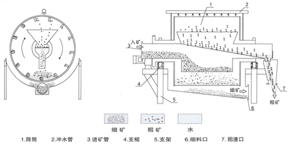料漿分級(jí)篩主要由篩網(wǎng)、提渣板、沖洗水管、收渣斗、進(jìn)漿排渣管、接礦斗和傳動(dòng)機(jī)構(gòu)組成。工作時(shí),裝配篩網(wǎng)的圓筒在傳動(dòng)機(jī)構(gòu)的驅(qū)動(dòng)下旋轉(zhuǎn),礦漿從進(jìn)漿排渣管的左下部給入到篩網(wǎng)的圓周上。細(xì)粒礦物和水穿過篩網(wǎng)落入到接礦斗,沿管道自流至下一道工藝。粗粒部分被提渣板提至頂部被沖洗水沖入收渣斗排走。
